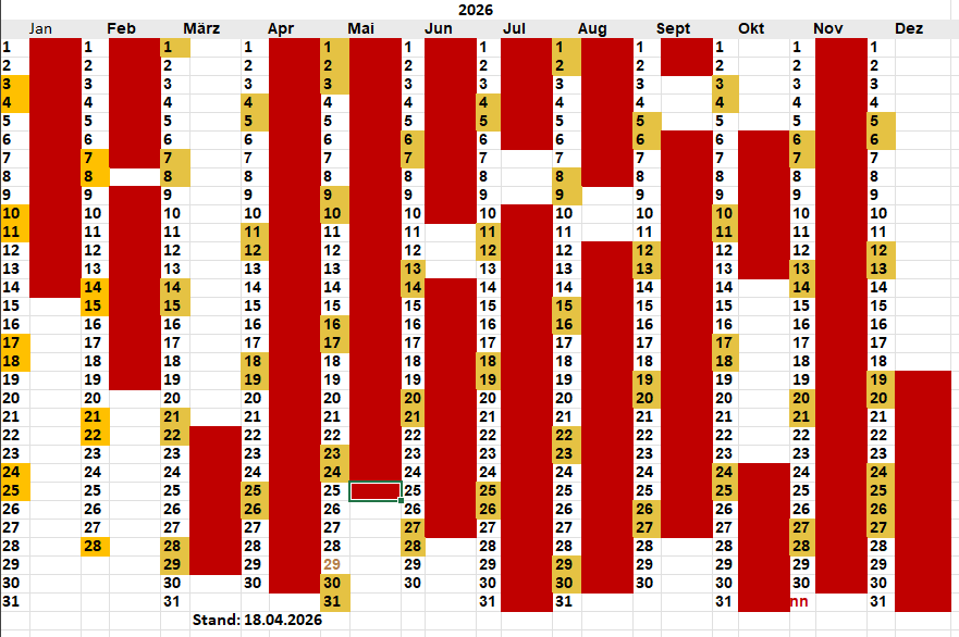 Belegung:  bitte beachten, der erste und letzte Tag ist An- bzw. Abreisetag